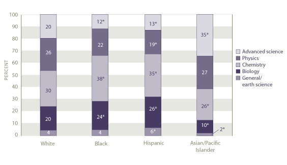 A higher percentage of White graduates completed advanced science courses than their Black and Hispanic counterparts. Asian/Pacific Islander graduates completed advanced science courses at a higher rate than graduates of all other racial/ethnic groups.