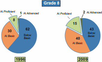 Likewise, a higher percentage of eighth-graders from lower-income families performed at Proficient in 2009 than in 1996.