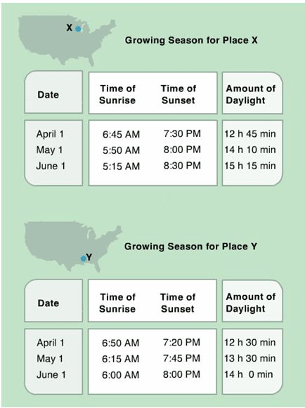 Two farmers grow tomato plants in two places, X and Y, shown on the maps below. You are now ready to decide which of the two places is better for growing tomato plants. The two tables below show sunrise times, sunset times, and the amount of daylight during the growing season in each place.